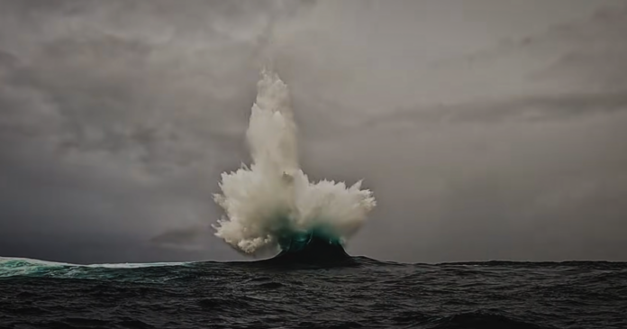 But the team also grabbed a stack of footage of this unique ocean phenomenon happening over and over again. And it’s not two waves converging – in many cases it’s actually two giant 12-footers colliding with another two smaller waves backwashing out from the shore, plunging simultaneously into a gap left by hydrodynamic forces over a reef close to the surface, causing a huge volume of water to rocket skyward as if a depth charge has gone off underneath the waves.