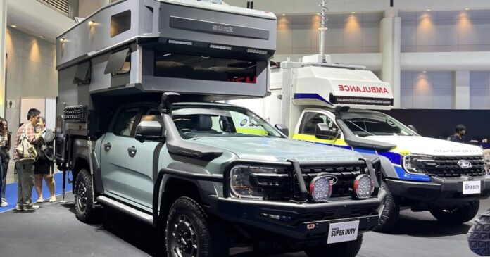 Possibly the most conspicuous among the multitude of Super Duties on display at Ford’s booth, the camper truck was put together by Chon Buri-based pickup camper specialist Sure Camper. The oversized, hard-sided module really drives home Ford’s point that the Ranger Super Duty is a “midsize truck that can do things no other midsize truck can do.” In this case, it can put its reinforced chassis and rear axle to work in carrying much more than the small, ultralight campers and toppers to which other Rangers and midsize trucks are limited.