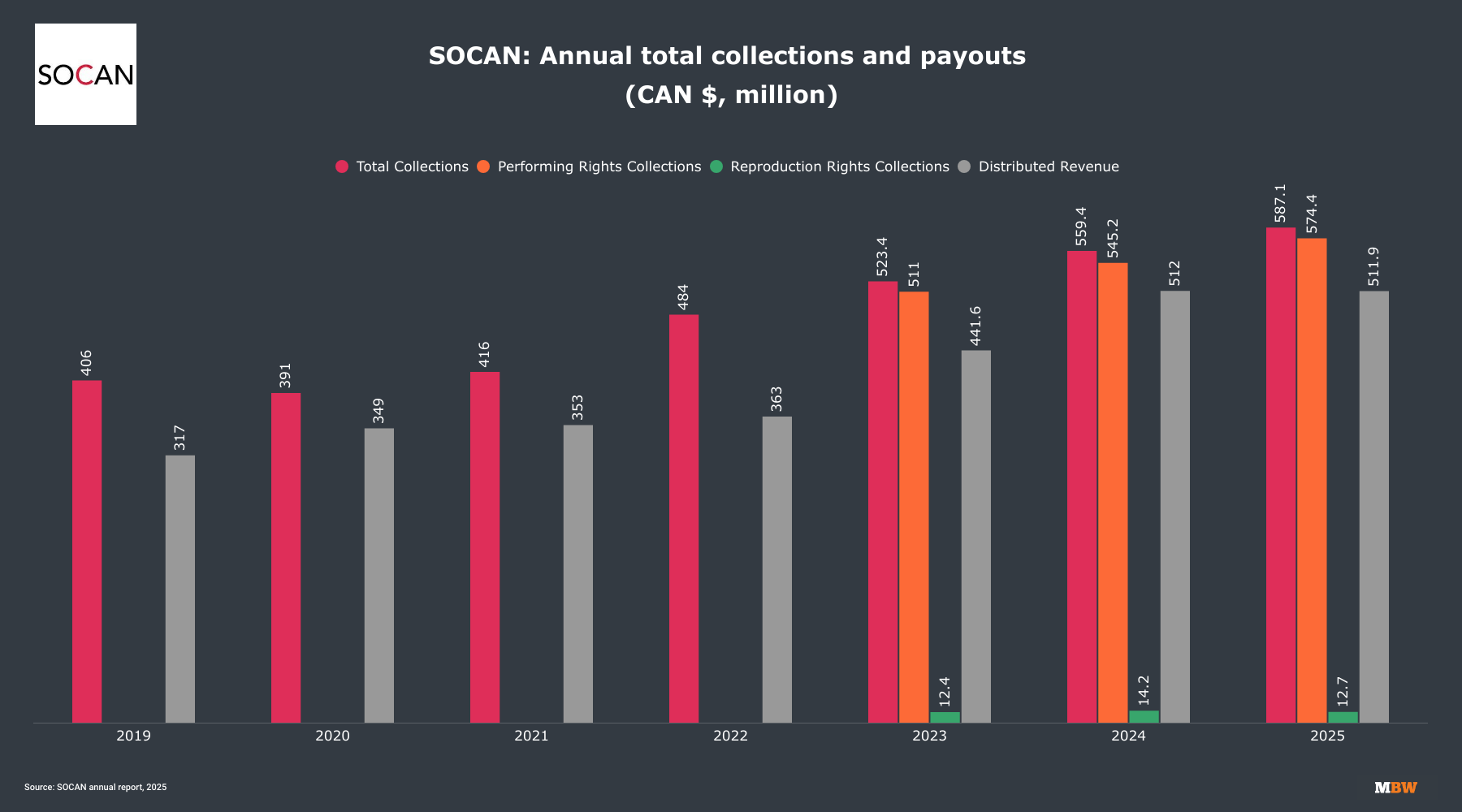 Canadian performing rights society SOCAN generated revenues of CAD $587.1 million ($420m) in 2025, up 5% compared with 2024.