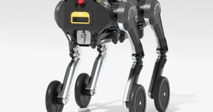 “Traditional” quadruped robots excel at traversing uneven terrain, stepping over obstacles and even climbing stairs while maintaining four stable points of contact with the ground while doing so. If you give them lockable wheels for feet, however, they can zip across flat, smooth terrain much quicker and more energy-efficiently than they could by running.