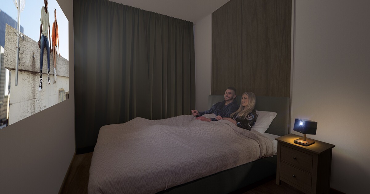 The projector is finished with tempered glass, suede accents, and anodized gold detailing, which are a clear step away from the usual matte plastic aesthetic that’s commonly found on other projectors. Its compact, sculpted form is designed to be a centerpiece, sitting atop a shelf or side table, and aiming to widen the projector’s role in a room, and make it about more than just projecting a huge image onto a wall.
