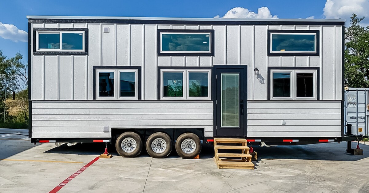 The Camden is based on a triple-axle trailer and is finished in engineered wood siding, with generous glazing and a steel roof. Power comes from a standard RV-style hookup.