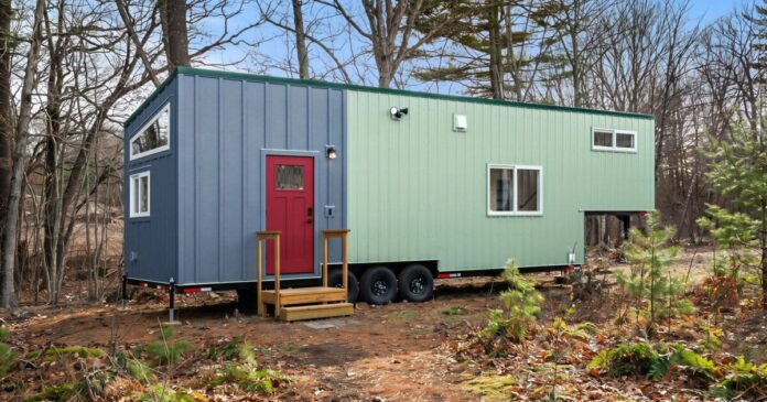 The Knoll is designed by Backcountry Tiny Homes and is based on a triple-axle gooseneck (raised) trailer. It comes in at a substantial length of 38 ft (11.6 m), while its width is 10 ft (3 m), meaning it offers a wider and more apartment-like layout inside than standard tiny houses – albeit at the cost of requiring a permit to tow on a public road. The home’s exterior is clad in a two-tone mixture of metal and board and batten siding, and is topped with a metal roof.