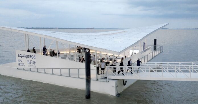AquaPraça is quite spacious and features seating areas, gathering zones in the corners, and an open central perimeter that frames the water below. It is covered by a sloped wide roof, providing a perfect shelter from the hot Brazilian sun or sudden tropical rain.