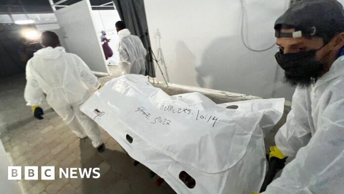 BBC Palestinian officials move a body bag containing the remains of an unidentified Palestinian, which were handed over by Israel as part of the Gaza ceasefire deal, at Nasser hospital, Khan Younis, southern Gaza (14 October 2025)BBC