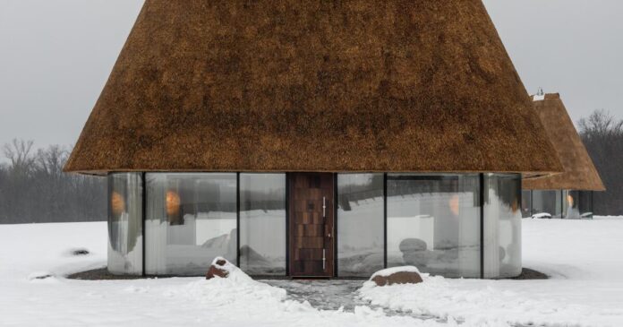 The project, named Guesthouse Under the Reed Roof, is located on a private estate in Ukraine and consists of three vacation homes, though they look basically identical, so we’ll focus on one.