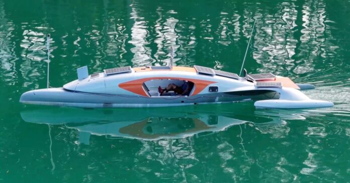Along with the pedal drive system, some of the additions include side panels (with openable windows) to enclose the rear cabin; a front daggerboard that can be lifted or lowered to help the trimaran track straight as needed; deck-mounted solar panels and a communications mast; a full satellite communications and navigation system; a custom recumbent pedaling seat; plus a separate lifeboat.