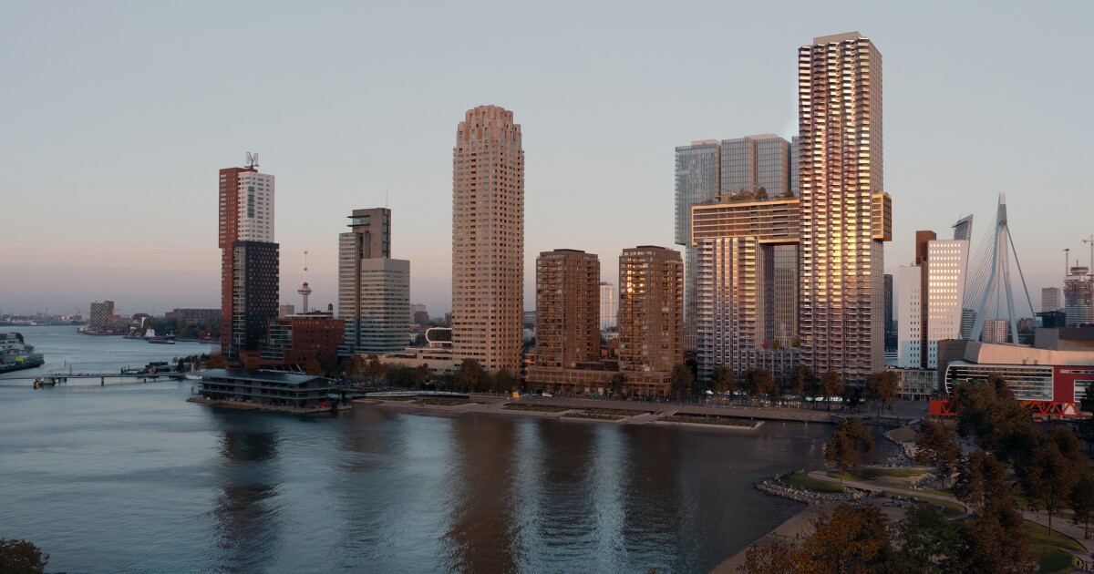 “The building’s distinctive saxophone-inspired silhouette, along with the facade design that undulates as it approaches the top of the towers, illustrates the jazzy character of Rotterdam,” explains MVRDV. “The building blends with its surroundings, and from different angles, light falling on the facade creates a constantly changing effect, enhanced by the interplay of bay windows and undulating balconies.”