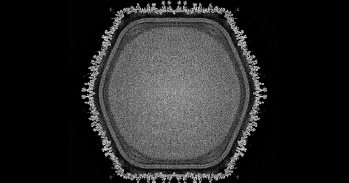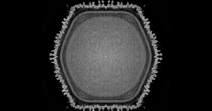 High-resolution imaging supports that possibility. Ushikuvirus forms an icosahedral capsid, a geometric shell that protects the viral genome, roughly 250 nanometers across, studded with spikes and distinctive cap structures not seen in medusaviruses. Some of these caps carry fibrous extensions, and laboratory staining suggests glycan components, complex sugar molecules, may decorate parts of the viral surface. Such modifications are thought to influence how viruses recognize and attach to host cells, potentially shaping host specificity over evolutionary time.