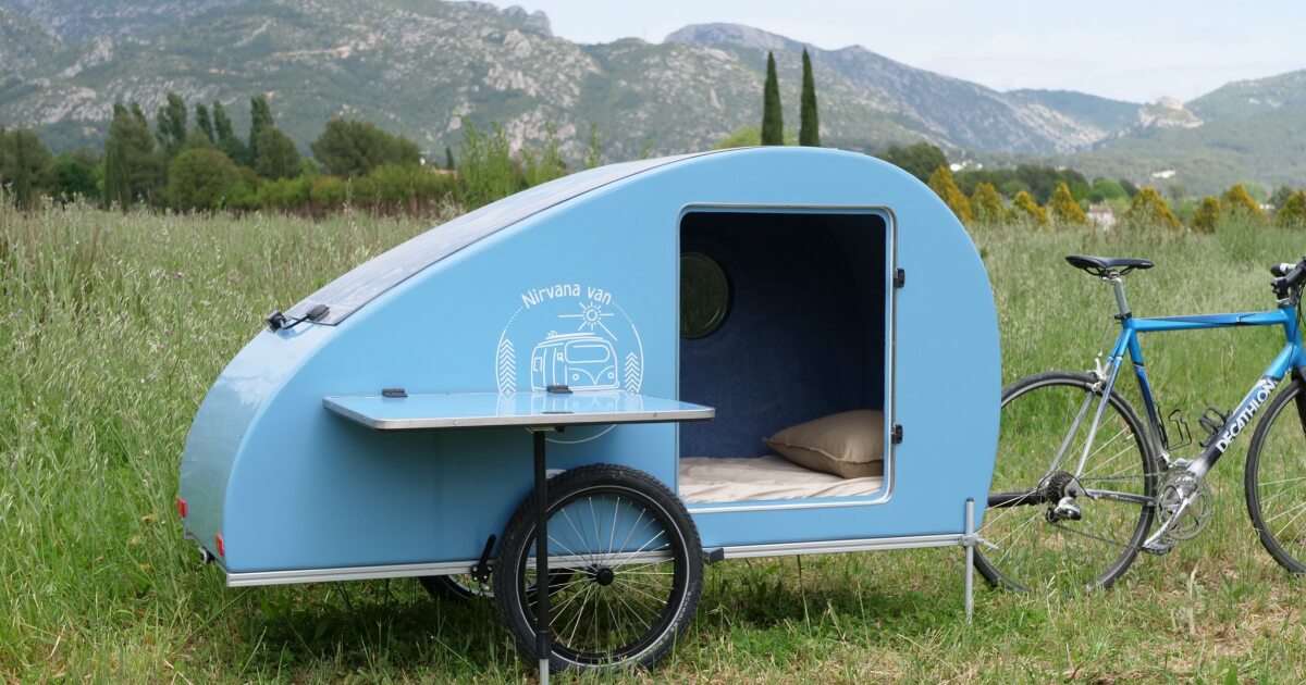 After several busy years of ebike and bicycle camper debuts, the segment really seemed to slow down in 2025. In fact, we only saw one new bicycle camper debut this year, in the form of the truly one-of-a-kind Spacecamper e-cargo-integrated nano-motorhome. Before the year officially twilights, though, one more bike camper has emerged and grabbed our attention. And it’s the one that bears the closest resemblance to a full-on automobile teardrop. The Bike Camper from France’s Nirvana Van can be left a basic empty shell or optioned up with kitchen equipment, solar-charged battery, windows and awning.