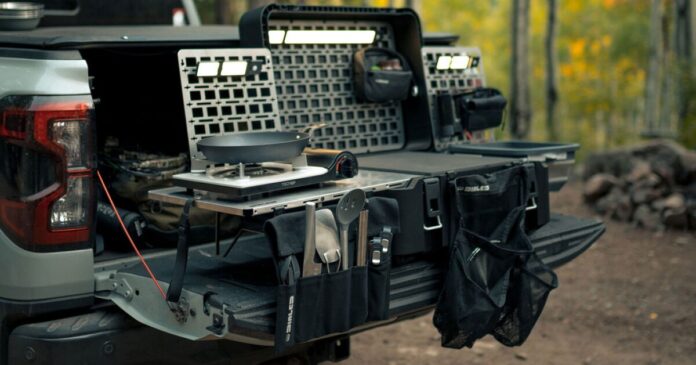 There’s additionally a sink that sits in its own bracket; a battery-powered faucet that fills the sink; a wood fiber cutting board; a mesh bag for drying and storing dishes; a canvas tool roll for storing utensils; two gear-organizing cubes; plus three dimmable battery-powered overhead LED lights.