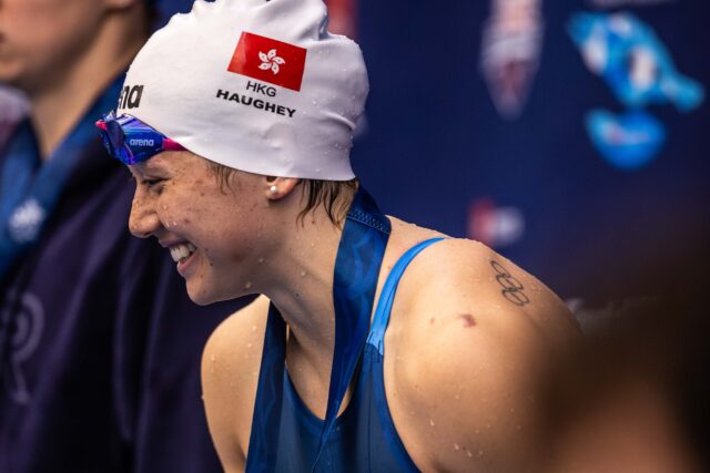 In the 100 free the next night, Haughey gave 2x defending world champion Marrit Steenbergen a run for her money, touching in 2nd at 52.40 to Steenbergen’s 52.33. Both times would have won world championships in Singapore last summer.
