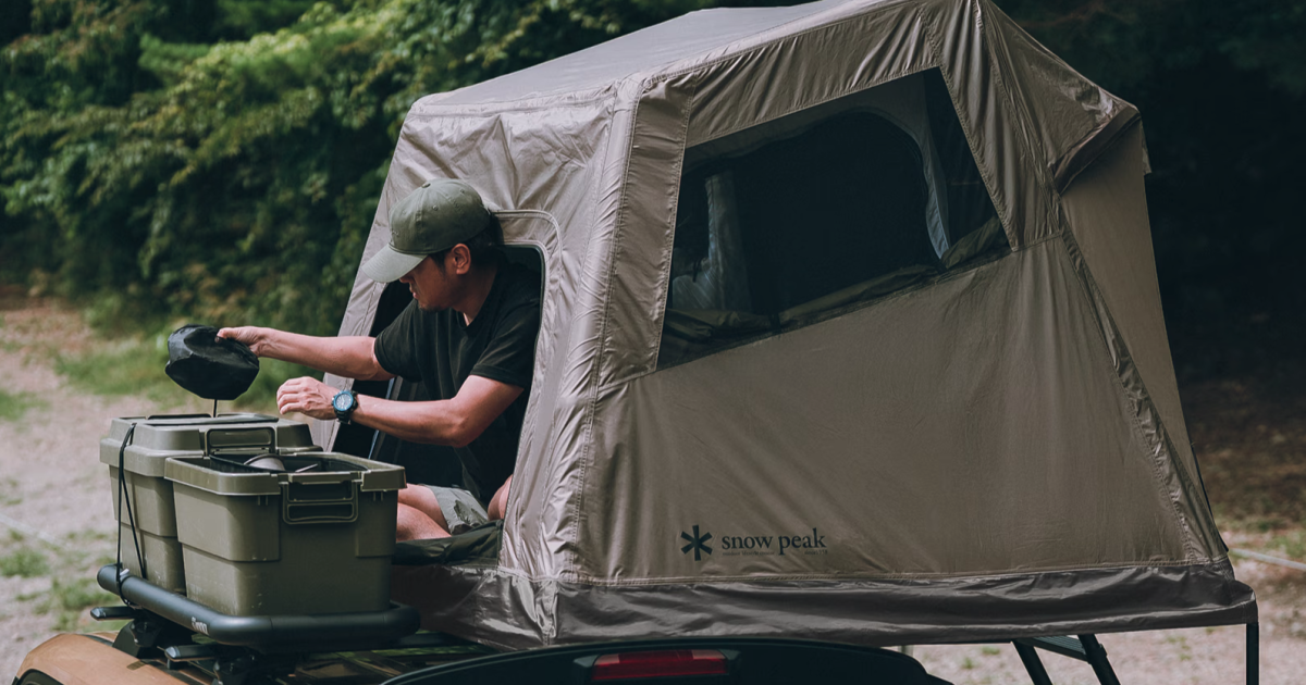 We initially thought the Field Rise was the very first rooftop tent from Snow Peak, but it was actually preceded by at least one other. In 2024, Snow Peak developed the Field Trailer, a boxy cargo trailer topped by a broad rooftop tent resembling its large framed cabin tents. That tent, which you can see aboard the Field trailer in the video below, was a traditional softshell tent with an expanded floor that folded out over the side of the trailer to double as an awning. It was designed to sleep four people.