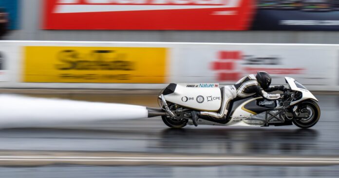 Over the eighth of a mile, the bike hit 209.93 mph (337.8 km/h) in 3.258 seconds, and reached 203.36 mph (327.2 km/h) at the 1,000-ft mark in 4.388 seconds. All of this unfolded at the Festival of Power at Santa Pod in the UK.
