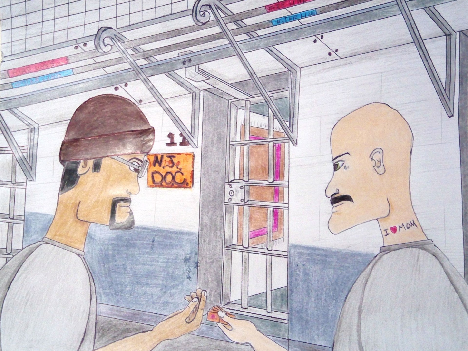 Martin Robles is also a prisoner at NJSP. These illustrations were made using lead and coloured pencils. As he has limited art supplies, Robles used folded squares of toilet paper to blend the pigments into different shades and colours.