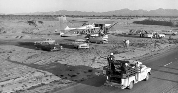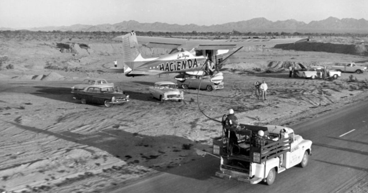 To pull in crowds from the flashier nearby casinos like The Sands and The Dunes (both of which, ironically, have been reduced to dust since then), a slot machine mechanic and former WWII bomber pilot named Robert “Bob” Timm pitched his boss a publicity stunt: fly a small plane nonstop for as long as humanly (and mechanically) possible, with “Hacienda” plastered on the side.