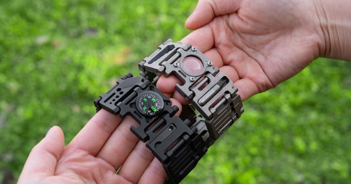 These include a bottle opener, whistle, magnifier, compass, spoke wrench, and a hex wrench for tightening loose bolts. The bottle opener comes in handy for when you need a cold one at the picnic or yard party. If you’re wandering into the wild and start to feel a chill, there’s a sparky fire starter embedded in the bracelet as well.