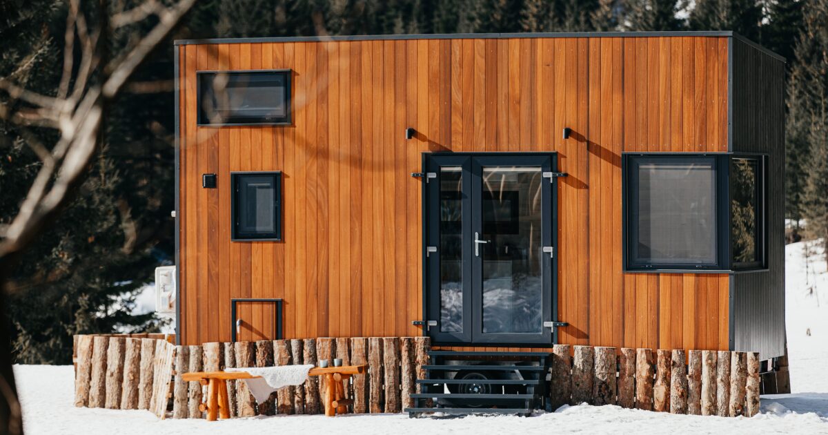 The tiny house’s exterior is finished in thermally treated wood, with a metal roof, and has a pleasantly chunky cuboid appearance that’s enlivened by its generous glazing. A glass door provides access to the interior, which is arranged around a central kitchen and looks light-filled. The kitchen area includes a small dining table, plus there’s a sink, an induction cooktop, and both lower and upper cabinetry. There’s also a little room to install some additional appliances if required.