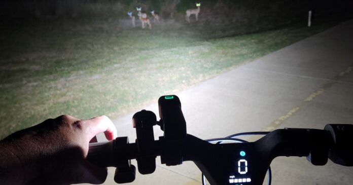 I know the Knog is called a “bike light,” but I mounted it to my ST3 Pro scooter and went out exploring some of the darkest areas of town at zero-dark-thirty last night (it sure beats riding in the Texas heat during the day).