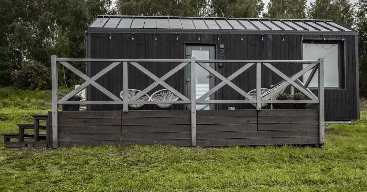 Designed by Sweden’s Vagabond Haven, the Venus is pretty small compared to most North American models we see nowadays, albeit it’s by no means the smallest we’ve seen. Its exterior is clad in engineered wood, or can be finished in the traditional Japanese Shou Sugi Ban method of charring the wood to protect and preserve it. This model is shown semi-permanently installed and has a deck area.