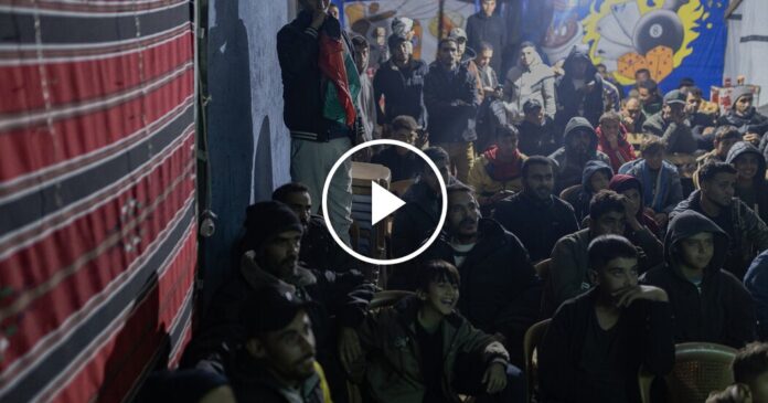 Palestinians in Gaza braved bad weather to gather on Thursday night to watch their national soccer team play Saudi Arabia in the knockout stages of the Arab Cup.