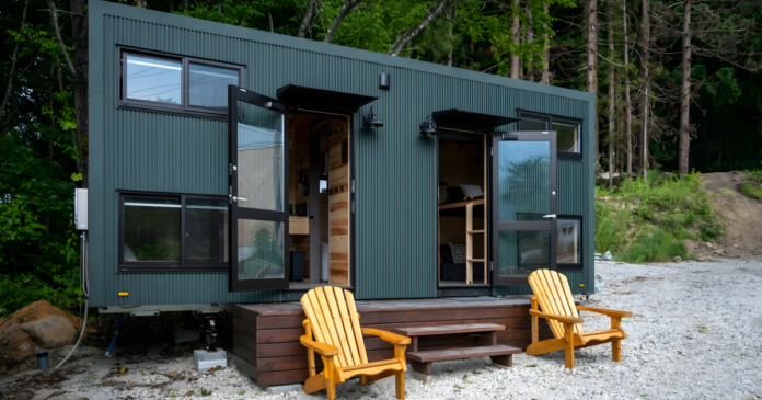 The living room is adjacent, on the lower floor. Judging by the photos, the ceiling height is… let’s call it “intimate,” so taller folks would definitely need to watch their heads. The room itself is simple but functional, with an L-shaped sofa and a table, plus a little storage. A ladder provides access to the bedroom above. Again, you’ll need to crouch, which is typical for tiny house lofts, and it contains a double bed.